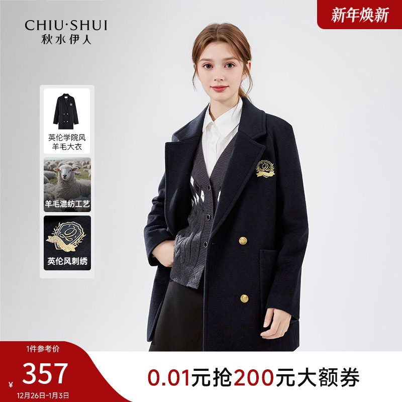 秋水伊人英伦学院风宽松款羊毛大衣2025冬季新款女装西服毛呢外套