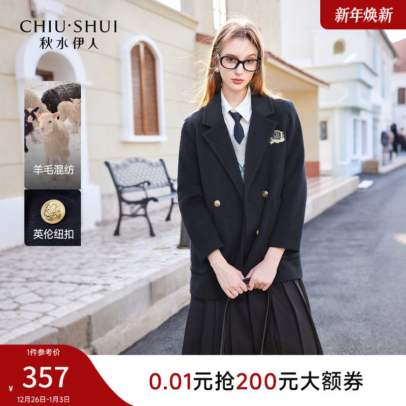 秋水伊人英伦学院风宽松款羊毛大衣2025秋冬新款女装西服毛呢外套