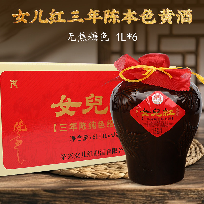 正宗绍兴特产女儿红黄酒本色无焦糖色三年陈花雕酒1L*6箱装老酒