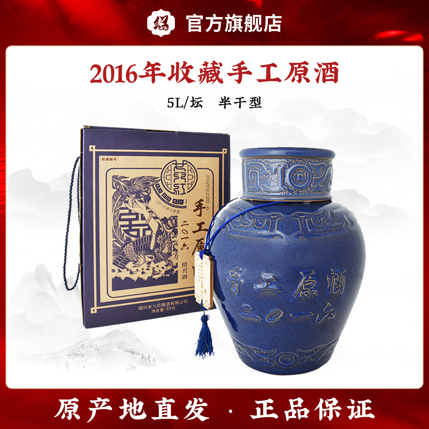 正宗绍兴女儿红黄酒2016年冬酿手工原酒5L礼盒箱装花雕酒绍兴老酒