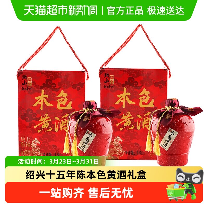 绍山鉴水十五年陈本色黄酒礼盒1.5L*2箱装绍兴无焦糖色糯米花雕酒