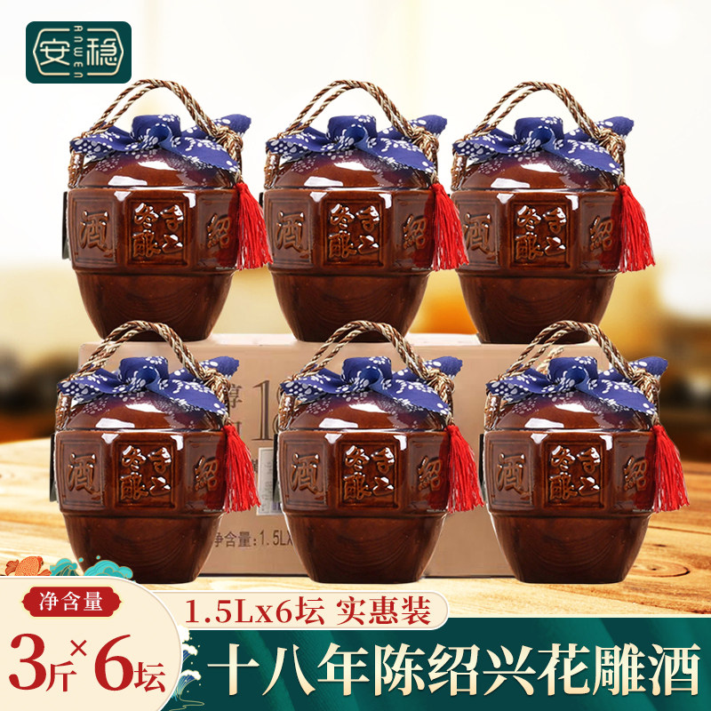 绍兴产黄酒 醇和十八年陈花雕酒1.5L*6坛箱装正宗一级糯米加饭酒