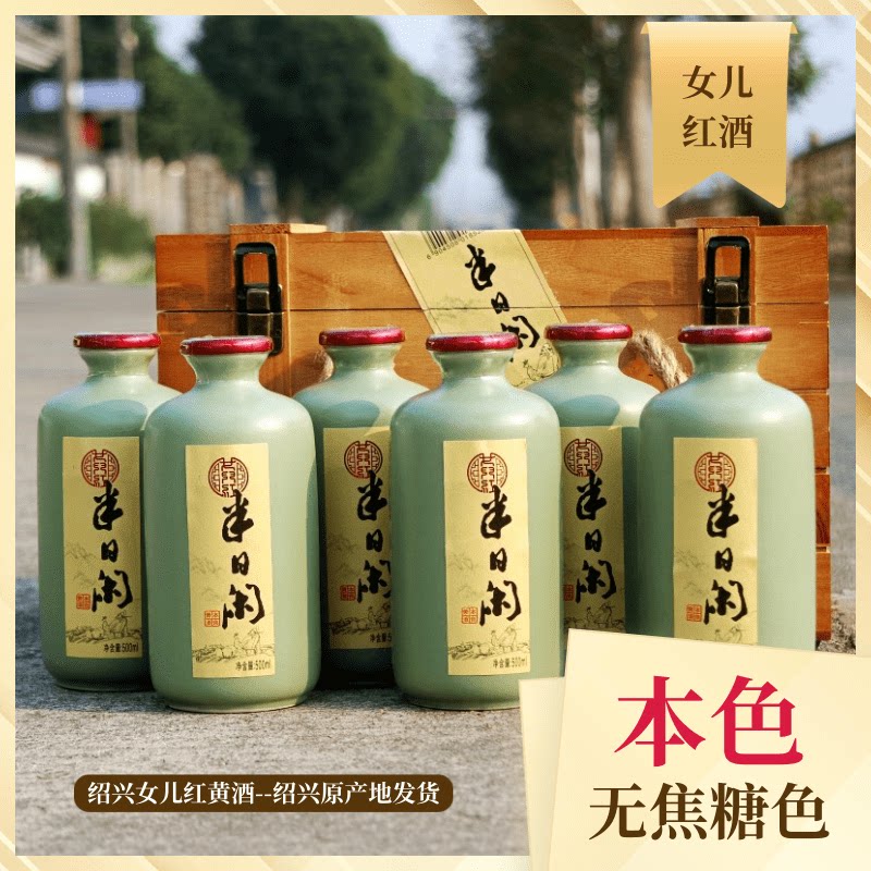 女儿红半日闲绍兴黄酒本色无焦糖色无添加木盒礼盒箱装500ml*6瓶