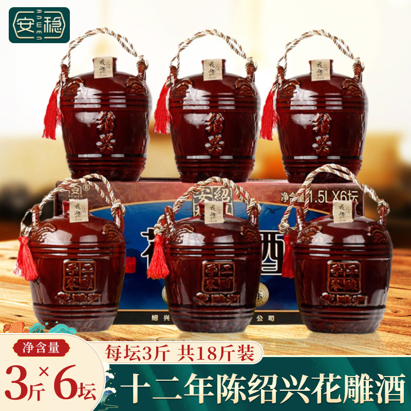 绍兴安稳黄酒 十二年陈花雕酒1.5Lx6坛箱装红装女儿老酒陶坛装
