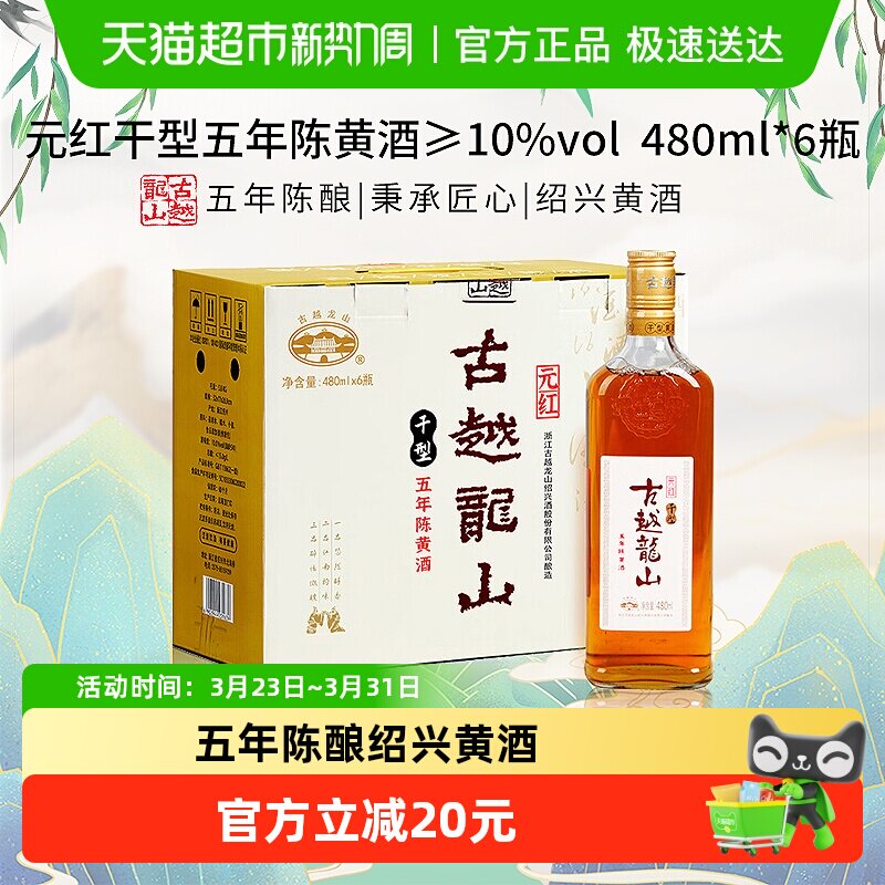 绍兴黄酒古越龙山五年陈元红酒低糖低度干型花雕老酒6/12瓶箱装