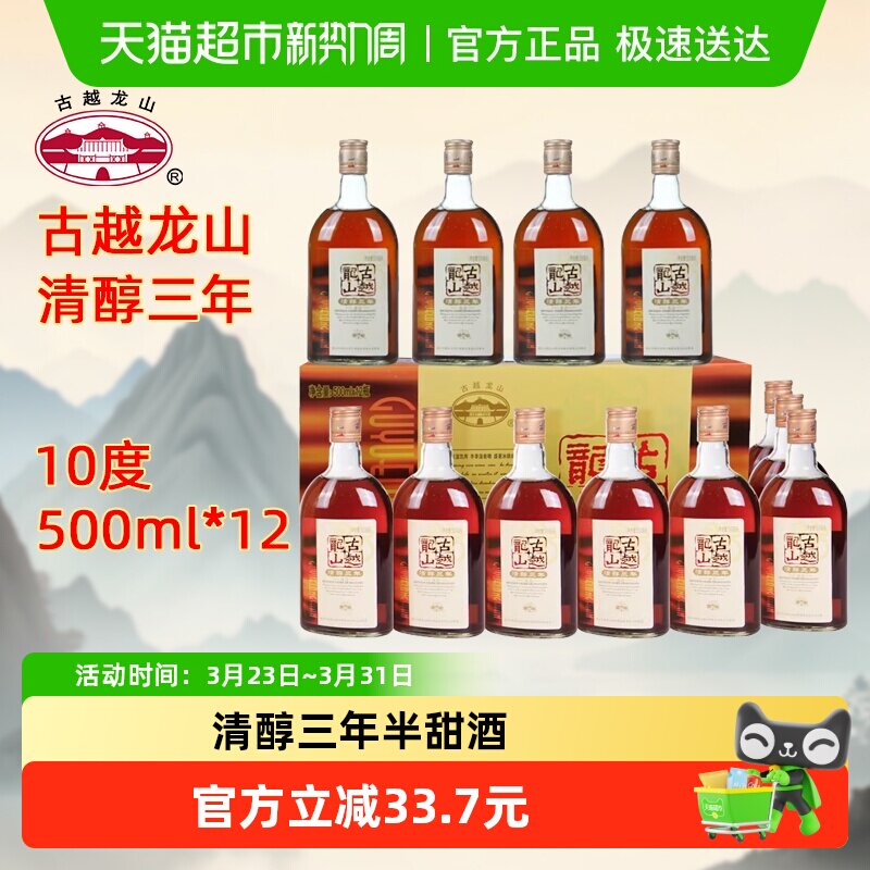 古越龙山绍兴黄酒清醇三年500ml*12瓶半甜型绍兴老酒箱装