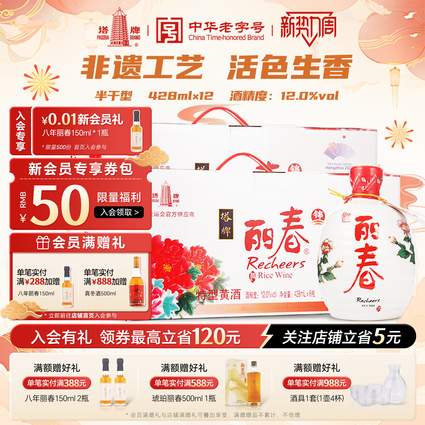 塔牌十年锦丽春黄酒428ml*6瓶*2箱装冬酿糯米花雕酒绍兴产黄酒