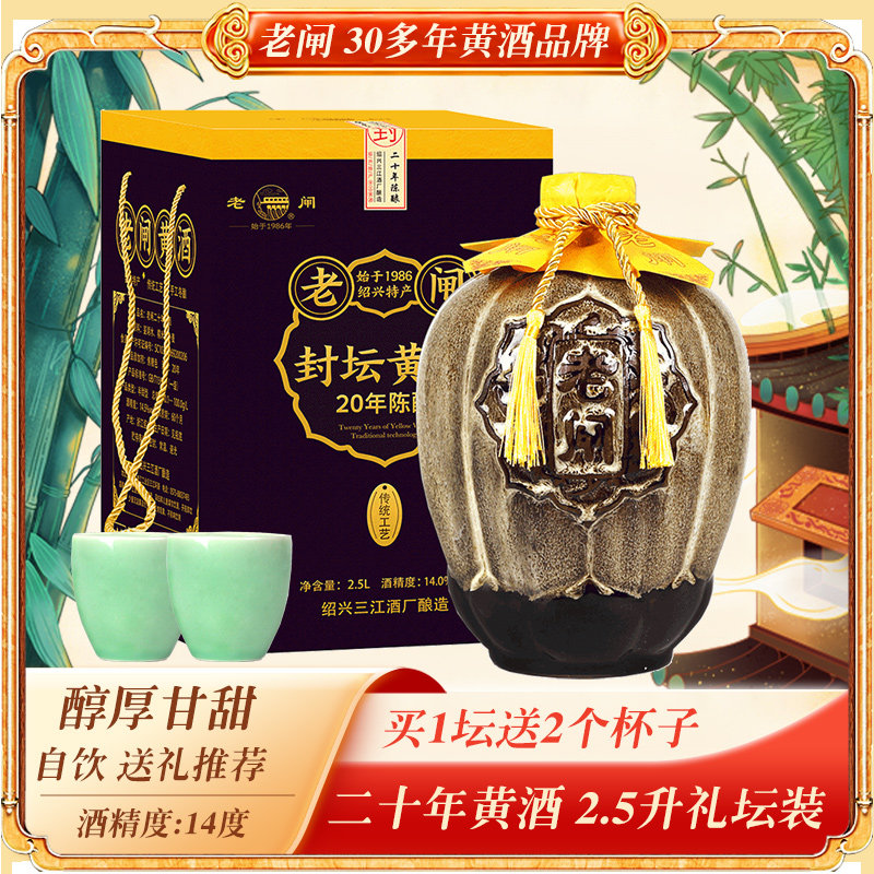 绍兴特产黄酒 老闸二十年陈封坛老酒2.5升礼箱装半甜花雕加饭自饮