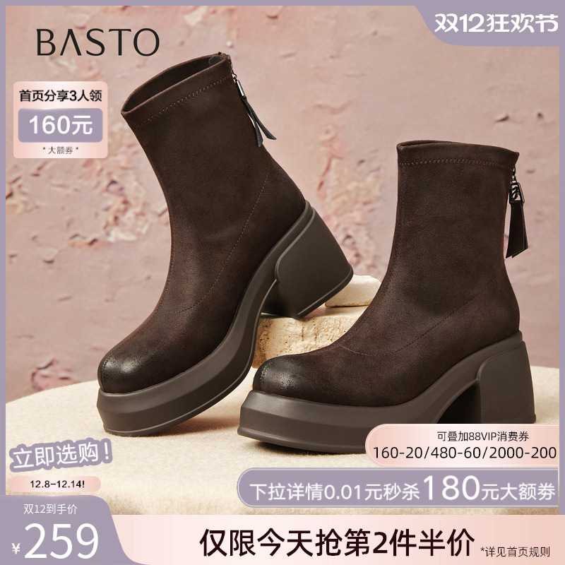 百思图25冬商场新款高跟粗跟女加绒短靴厚底增高马丁靴F6012DD5
