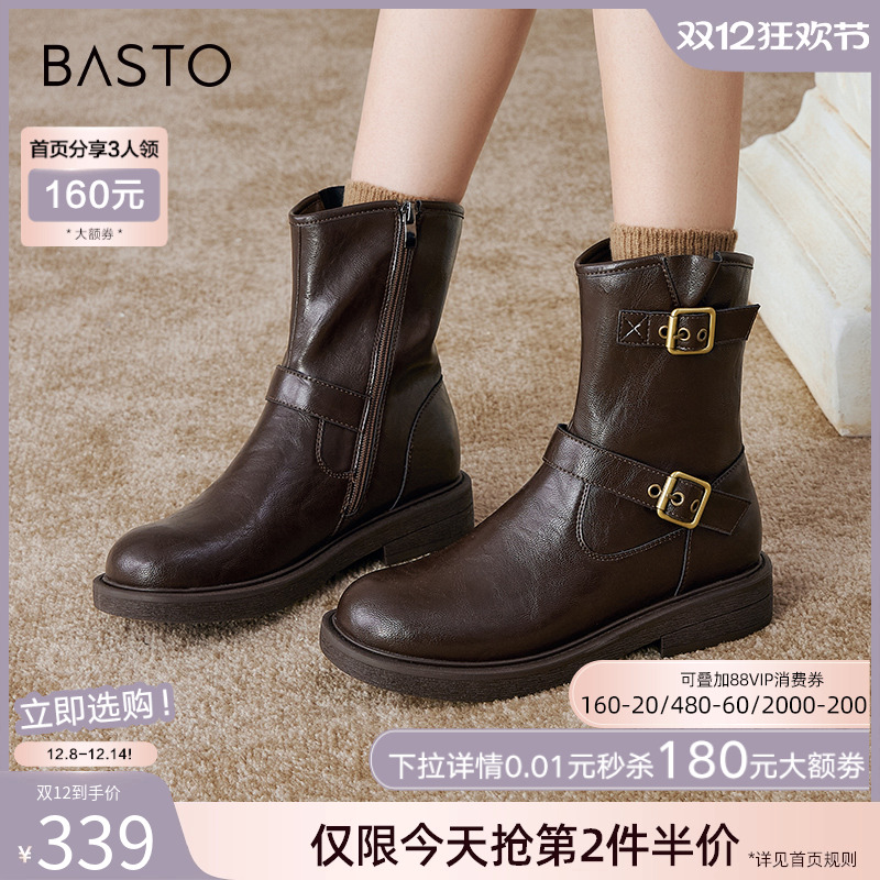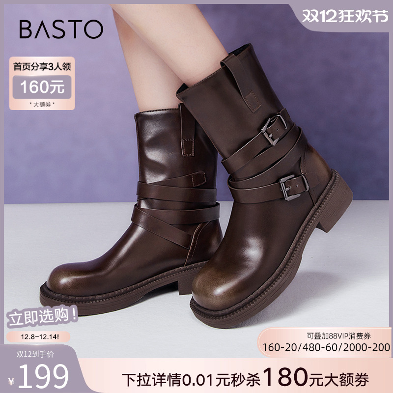 百思图2025冬季新款英伦西部靴复古粗跟马丁靴女中筒靴W9201DZ5