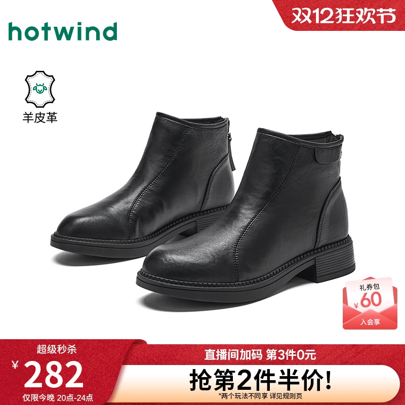 热风黑色马丁靴女2025年冬季新款百搭休闲短靴粗跟时装靴子女鞋子