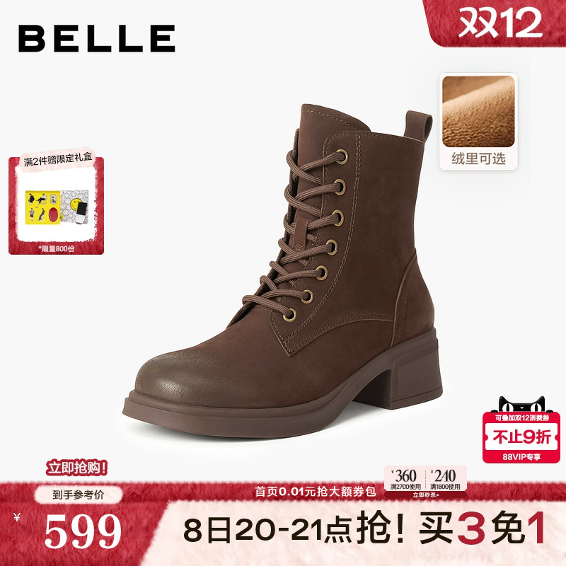 百丽英伦风羊皮马丁靴子女冬季加绒新款粗跟增高短靴子3NW45DD5
