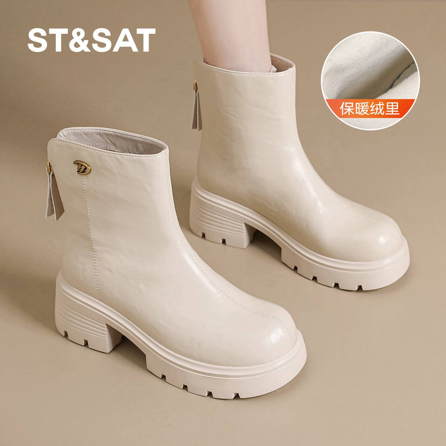 星期六女士白色靴子短靴粗跟增高马丁靴秋冬皮面保暖显身材中筒靴