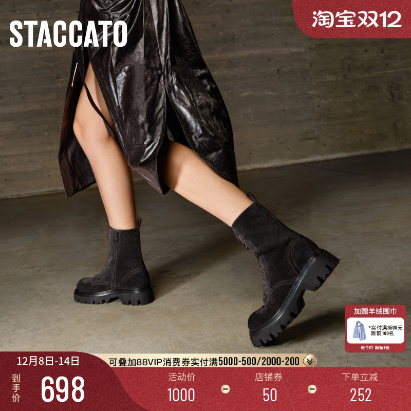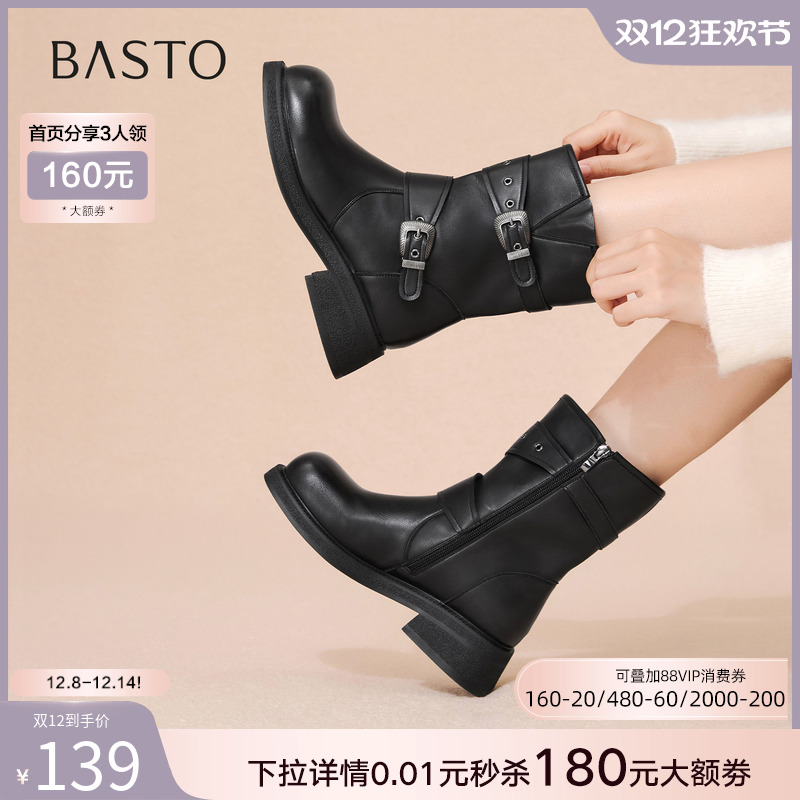 百思图冬季新款简约户外街头潮流马丁靴休闲靴粗跟女中靴CC886DZ4