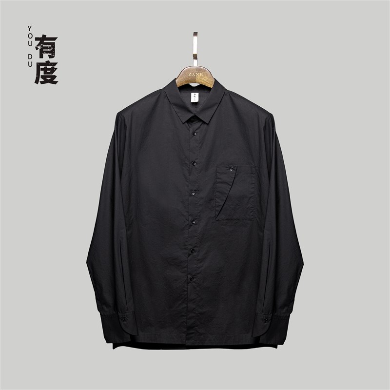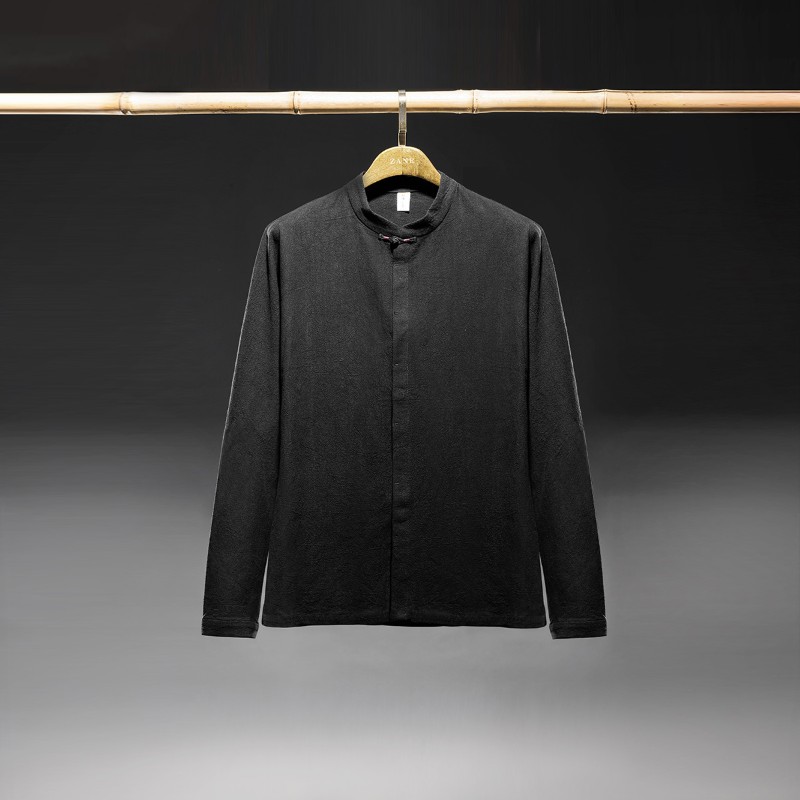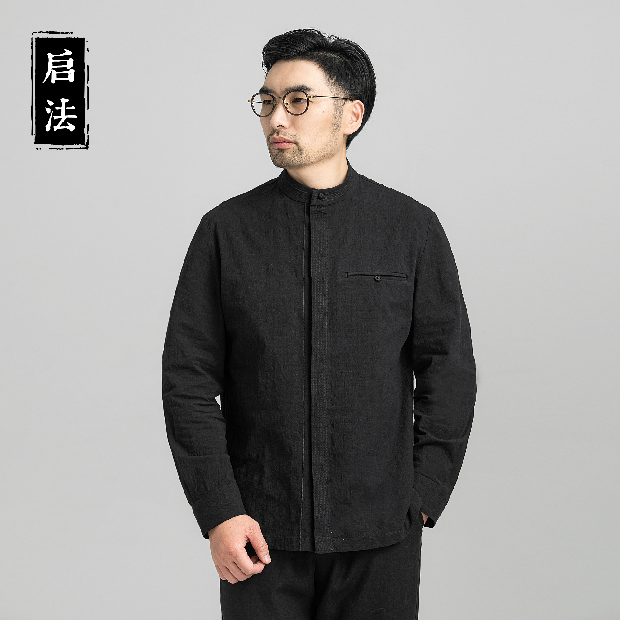 启法男装秋季全棉衬衫男士新款立领长袖衬衣男新中式百搭黑色上衣