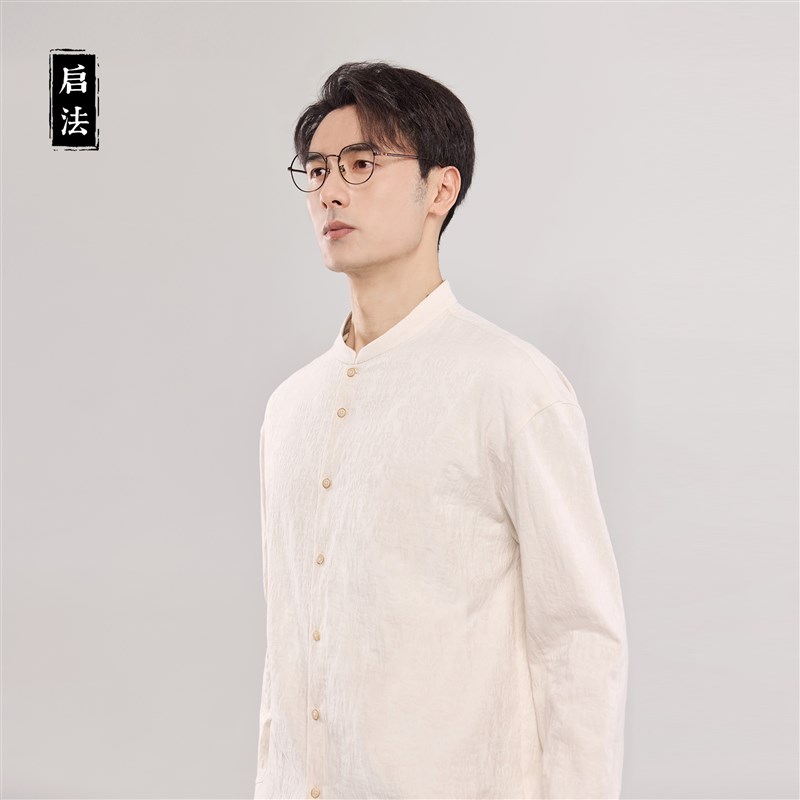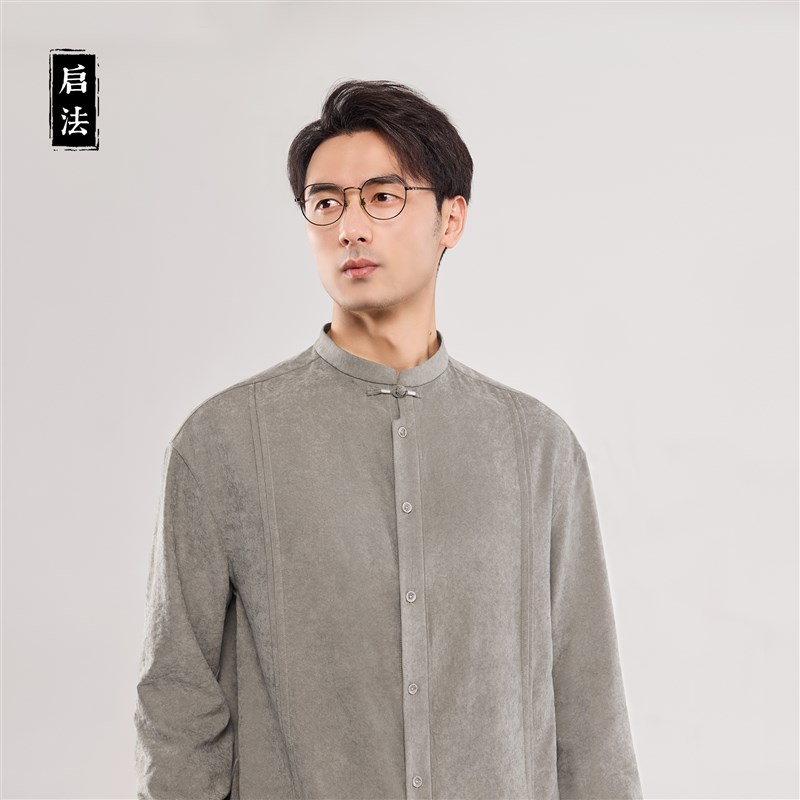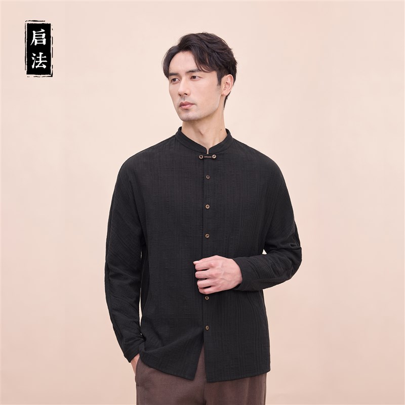 启法男装2025春季新款全棉立领衬衫男士新中式复古简约肌理感衬衣