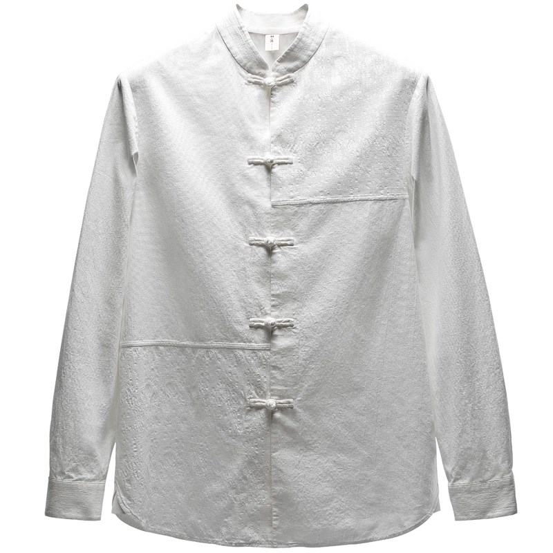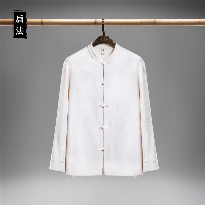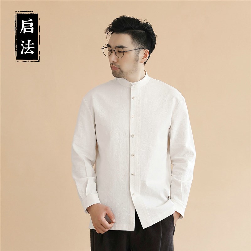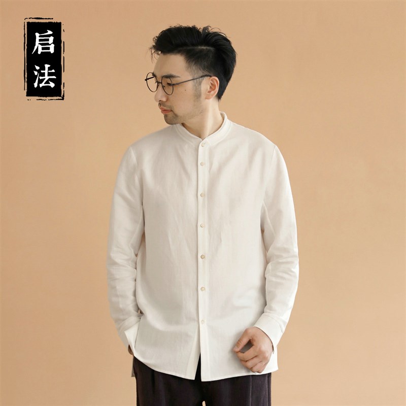 启法男装c秋季新款中国风衬衫男中式立领复古盘扣白衬衣男简约百