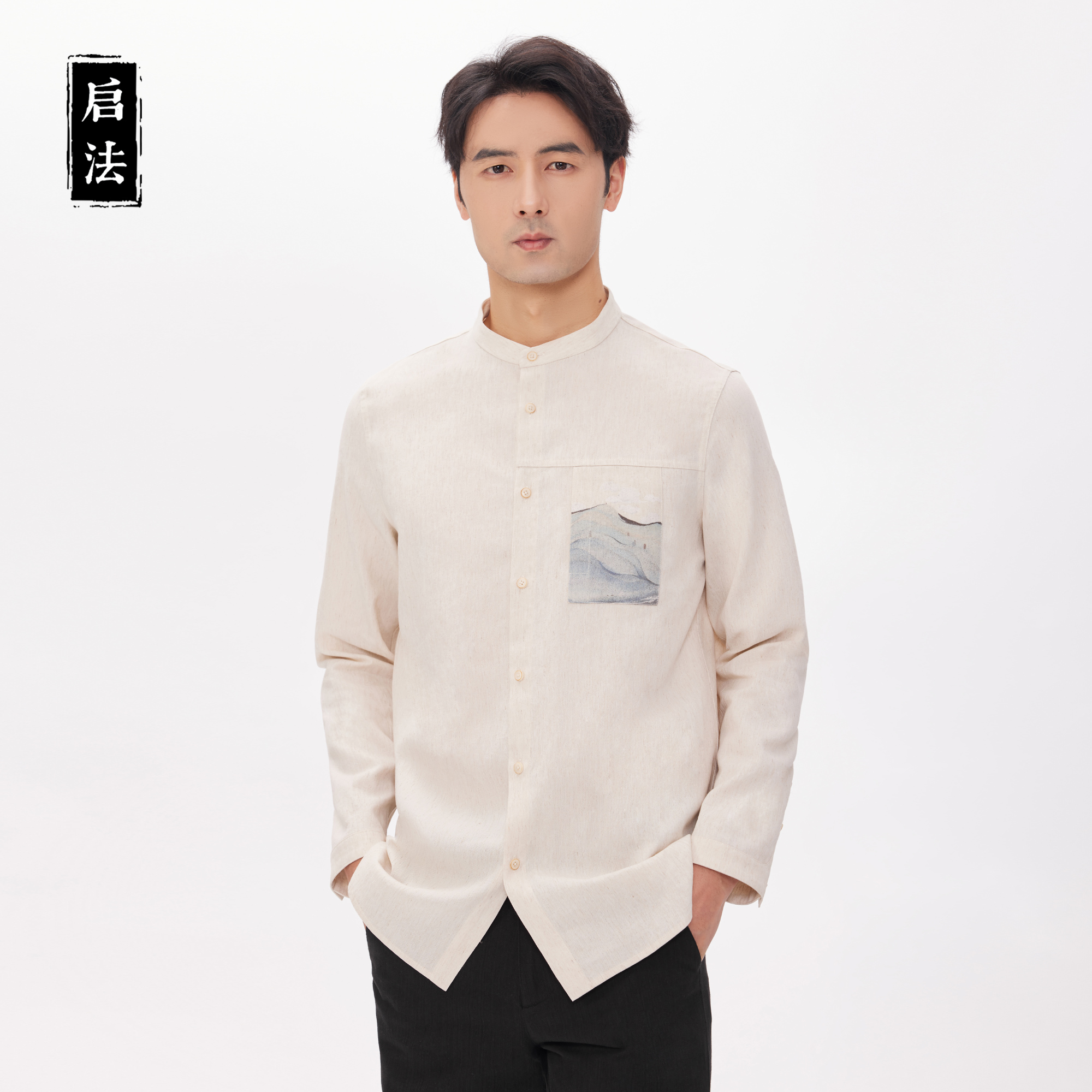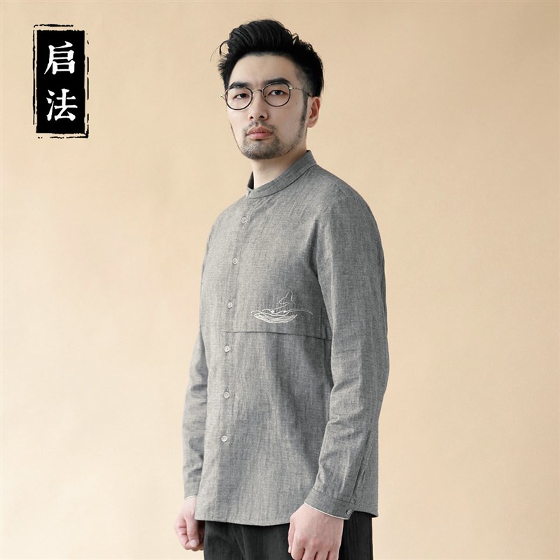 启法男装秋季新款衬衫男棉麻立领长袖衬衣男简约百搭亚麻刺绣衬衫