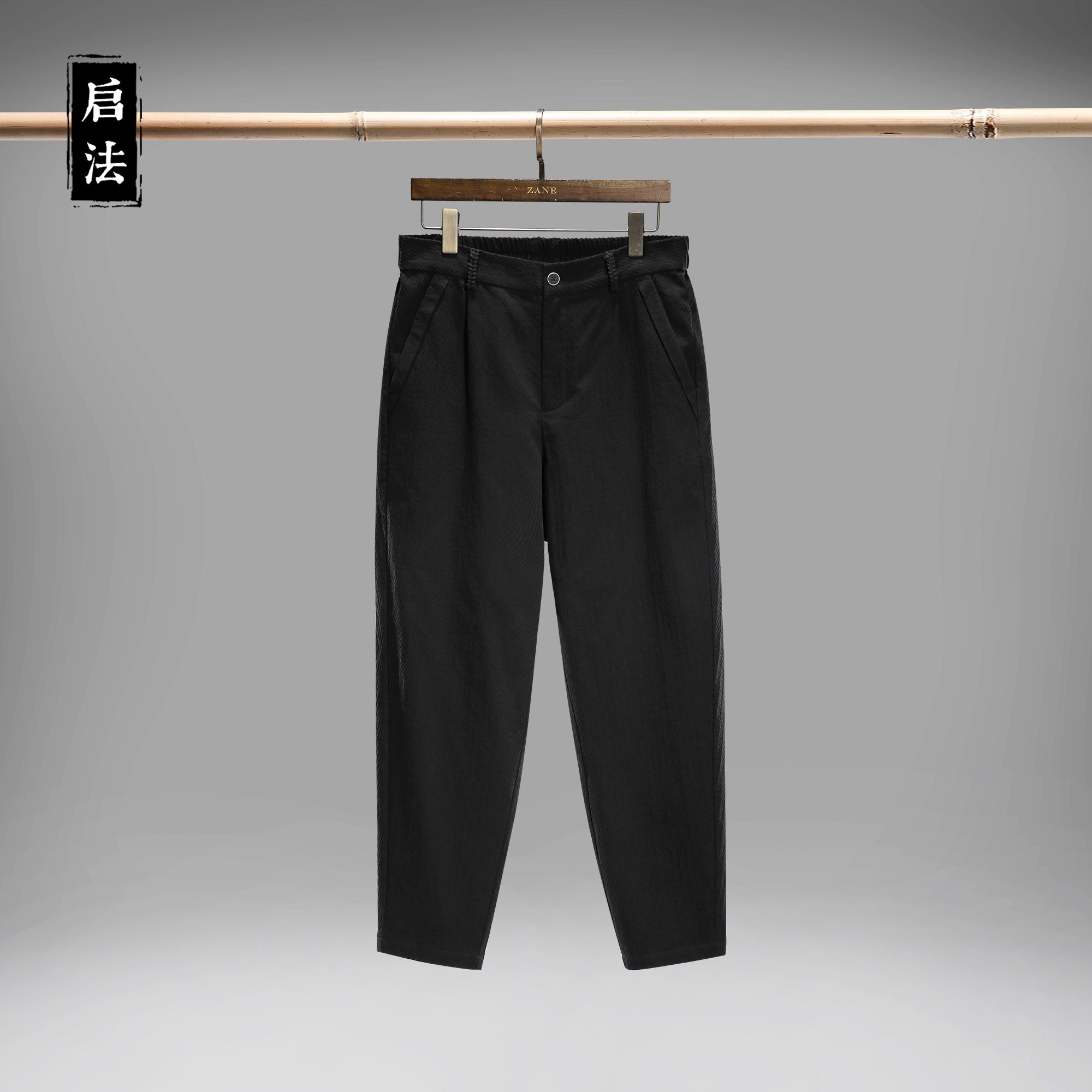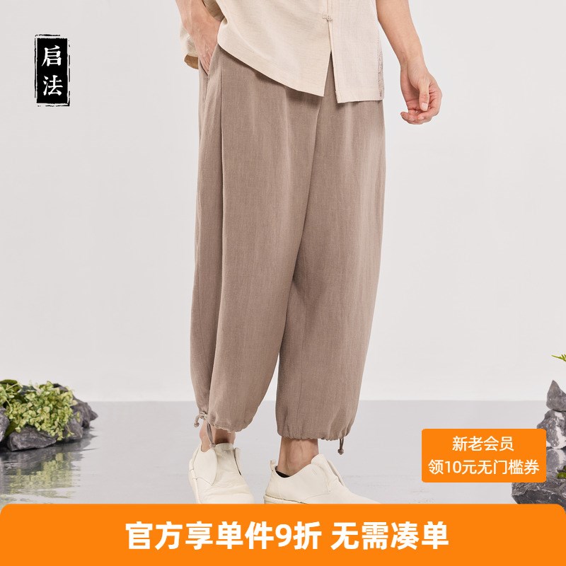 启法男装夏季简约宽松显瘦裤子男盘扣中国风休闲裤男士苎麻束脚裤