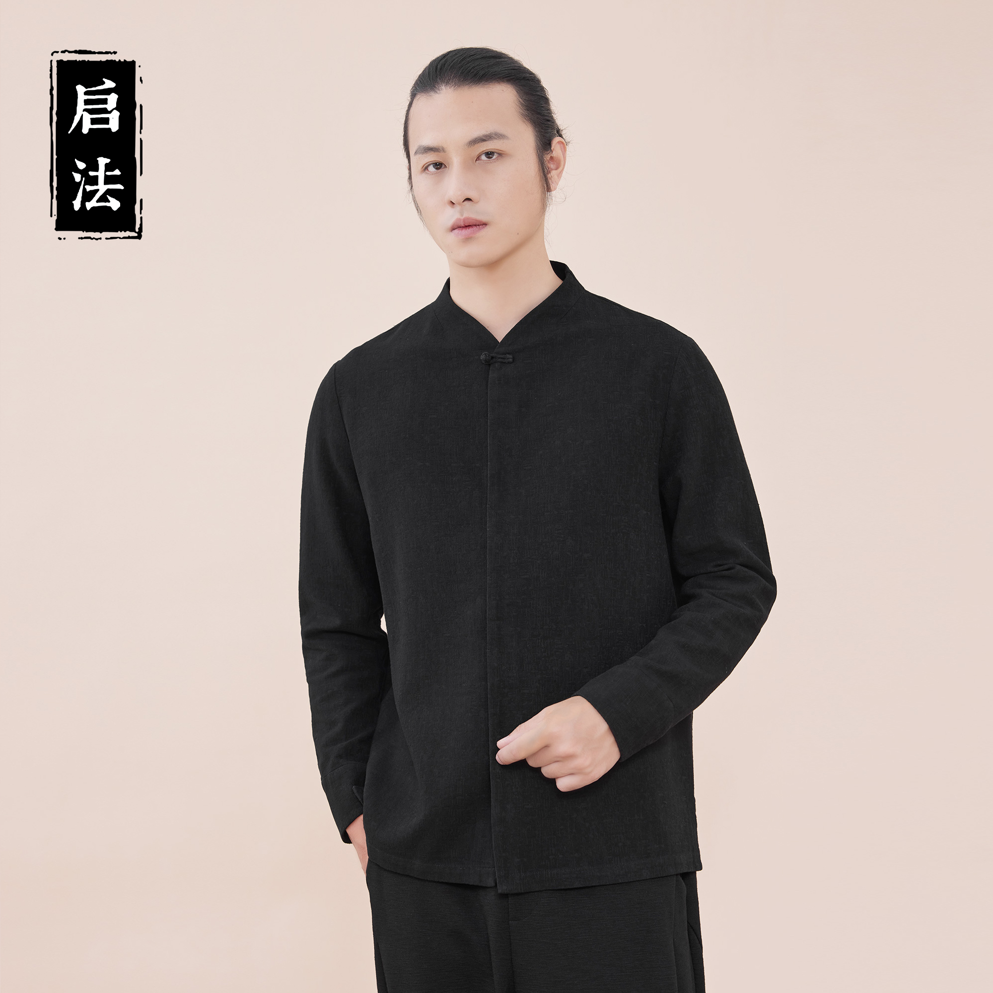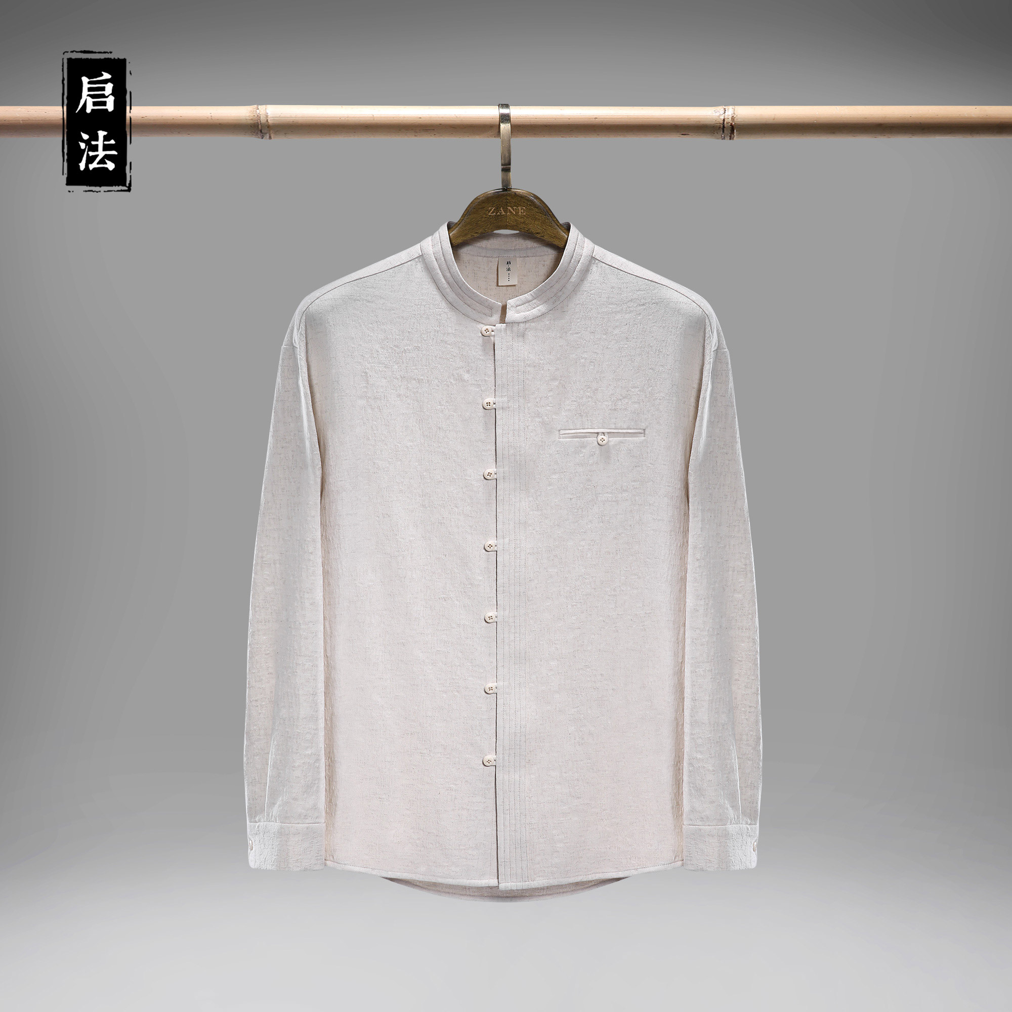 启法男装秋季新款中国风棉麻衬衫男宽松休闲立领盘扣亚麻长袖衬衣
