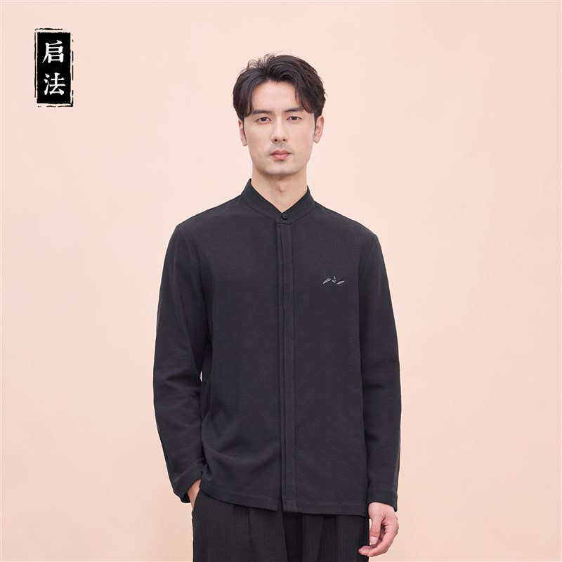 启法男装b2024春秋全棉长袖衬衫男士简约中国风盘扣立领新中式衬
