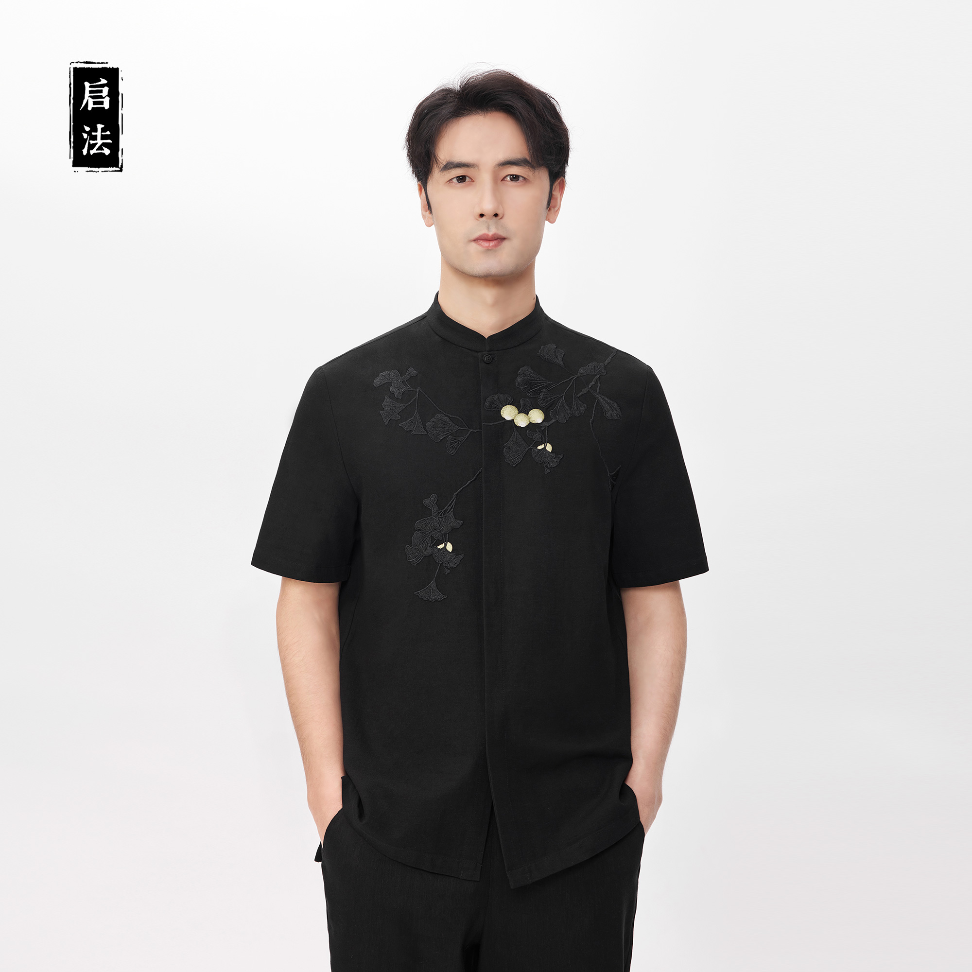 启法男装银杏重工刺绣衬衫短袖男夏季复古宽松百搭新中式苎麻衬衣