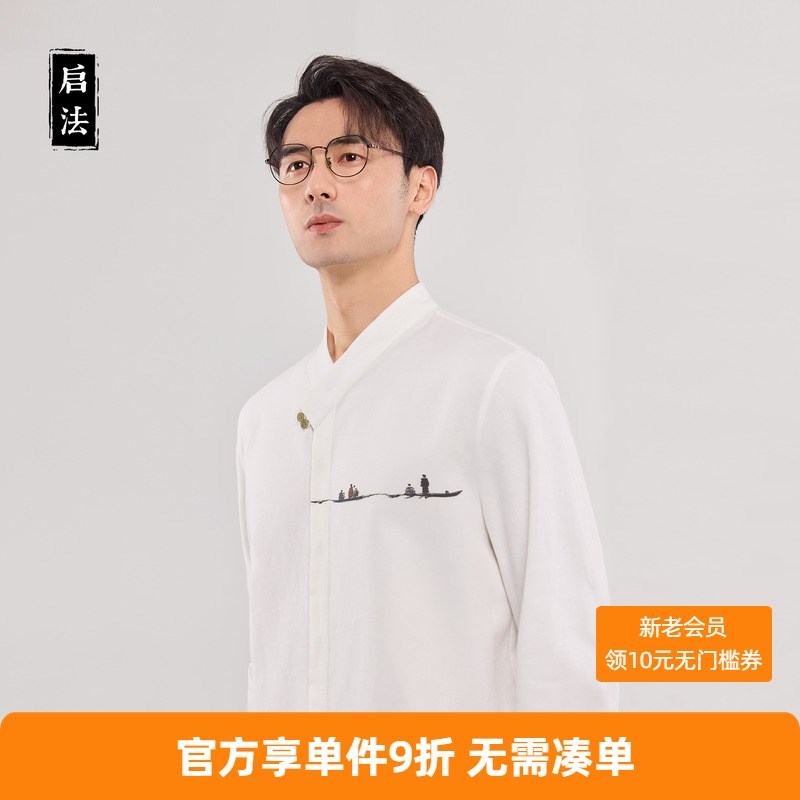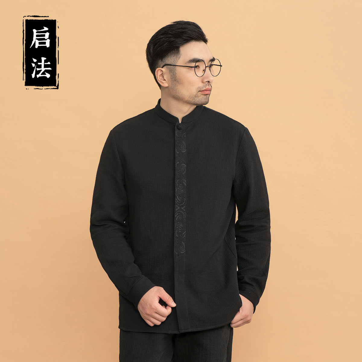 启法男装春新款复古复古交领刺绣衬衫男士新中式简约衬衣男士全棉