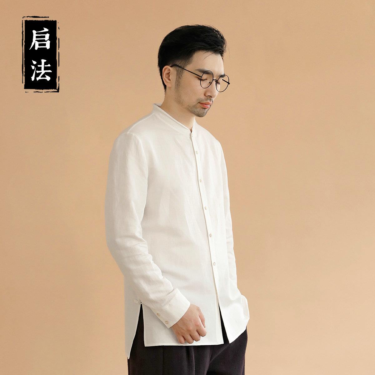 启法男装秋季新款中国风衬衫男士苎麻棉立领长袖衬衣男刺绣白衬衫
