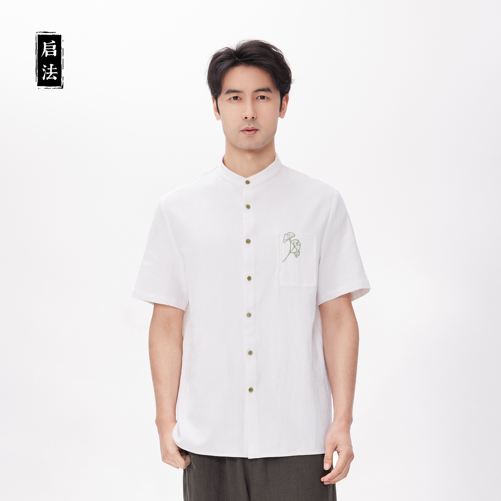 启法男装夏季棉麻立领衬衫男中国风刺绣短袖男士简约百搭亚麻衬衣