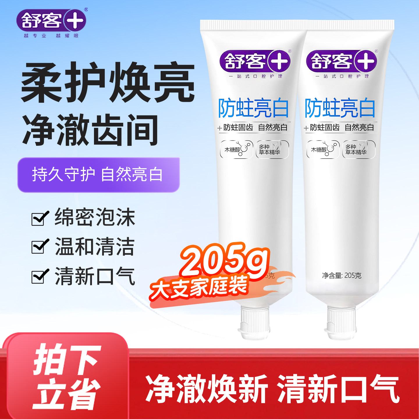 舒客舒克亮白牙膏205g大容量装清新口气洁齿护龈情侣男女通用款