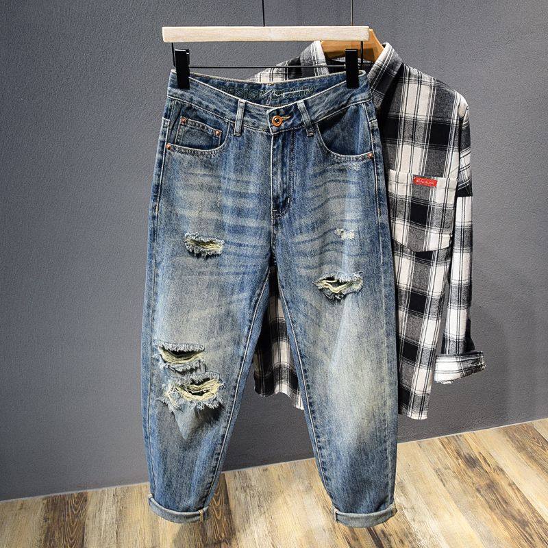 男裤子夏季款2023新款潮牌浅色乞丐九分破洞牛仔裤男宽松直筒哈伦