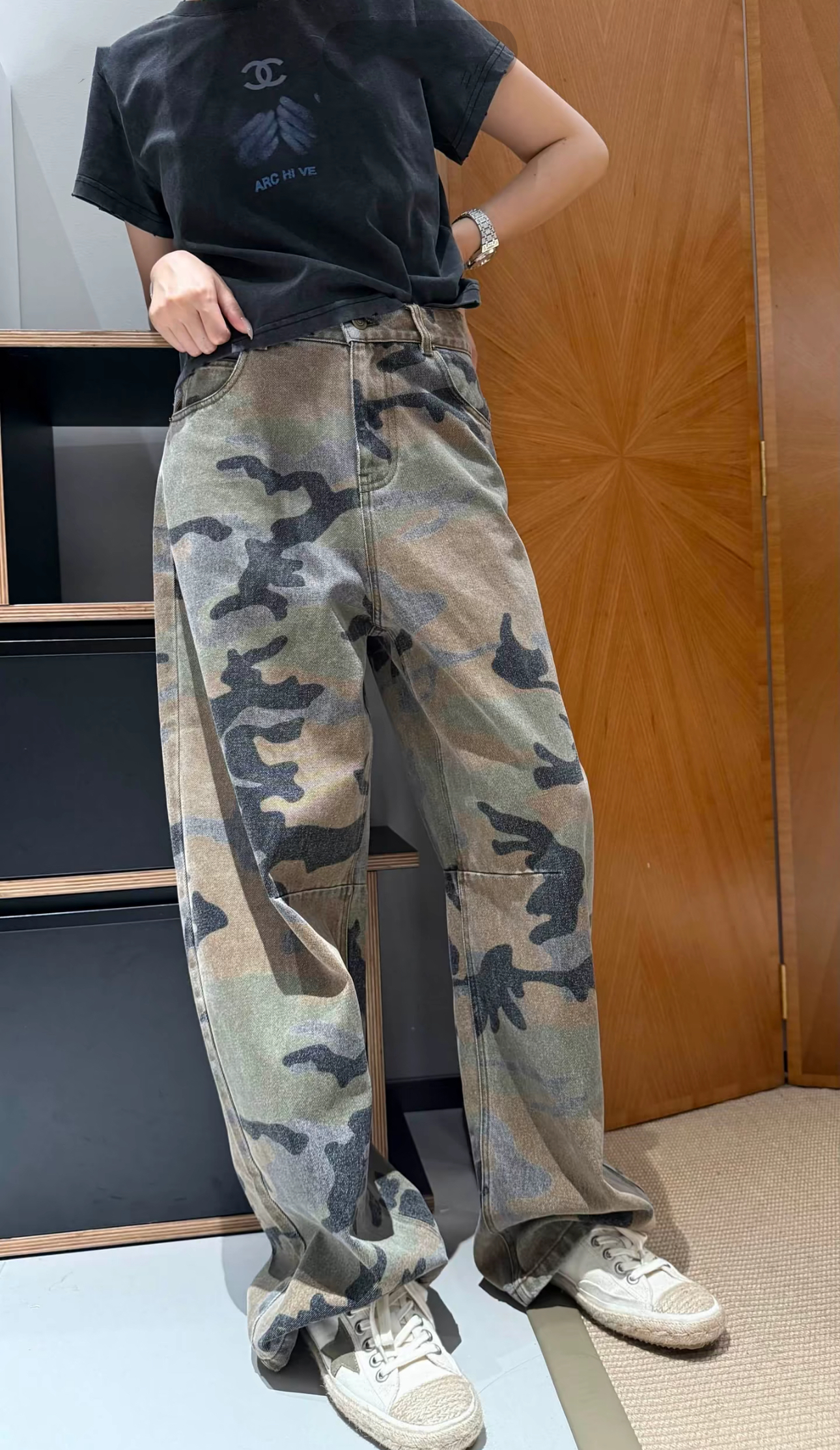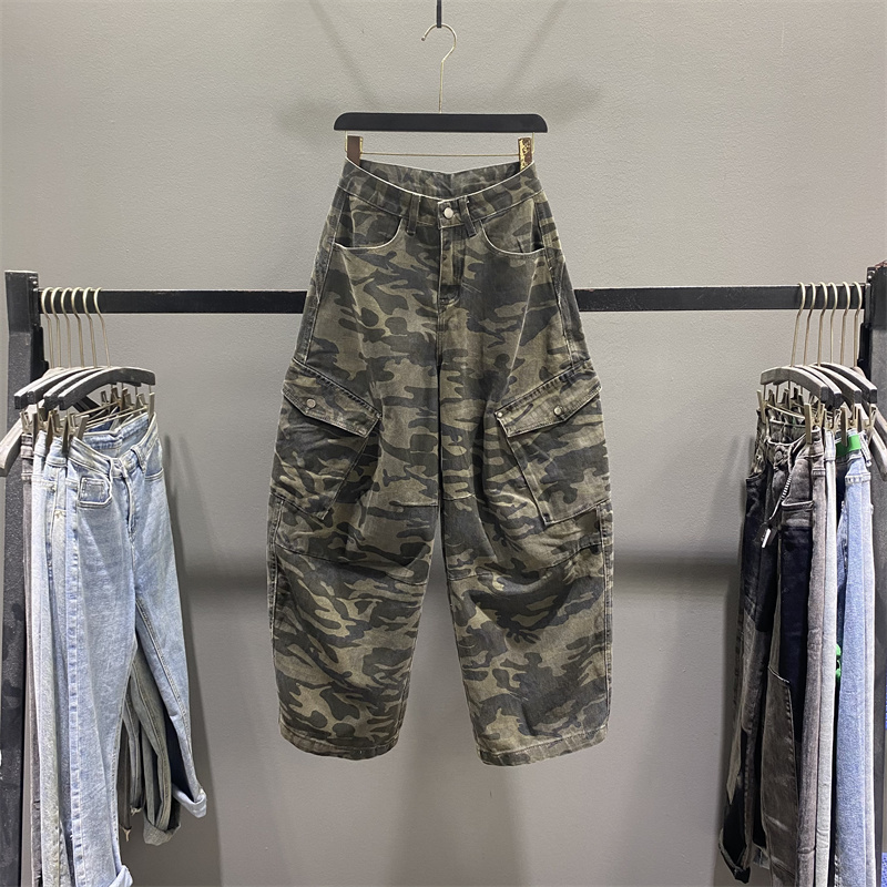 欧洲站2025秋季新款高腰阔腿慵懒复古美式高街迷彩裤欧货牛仔长裤