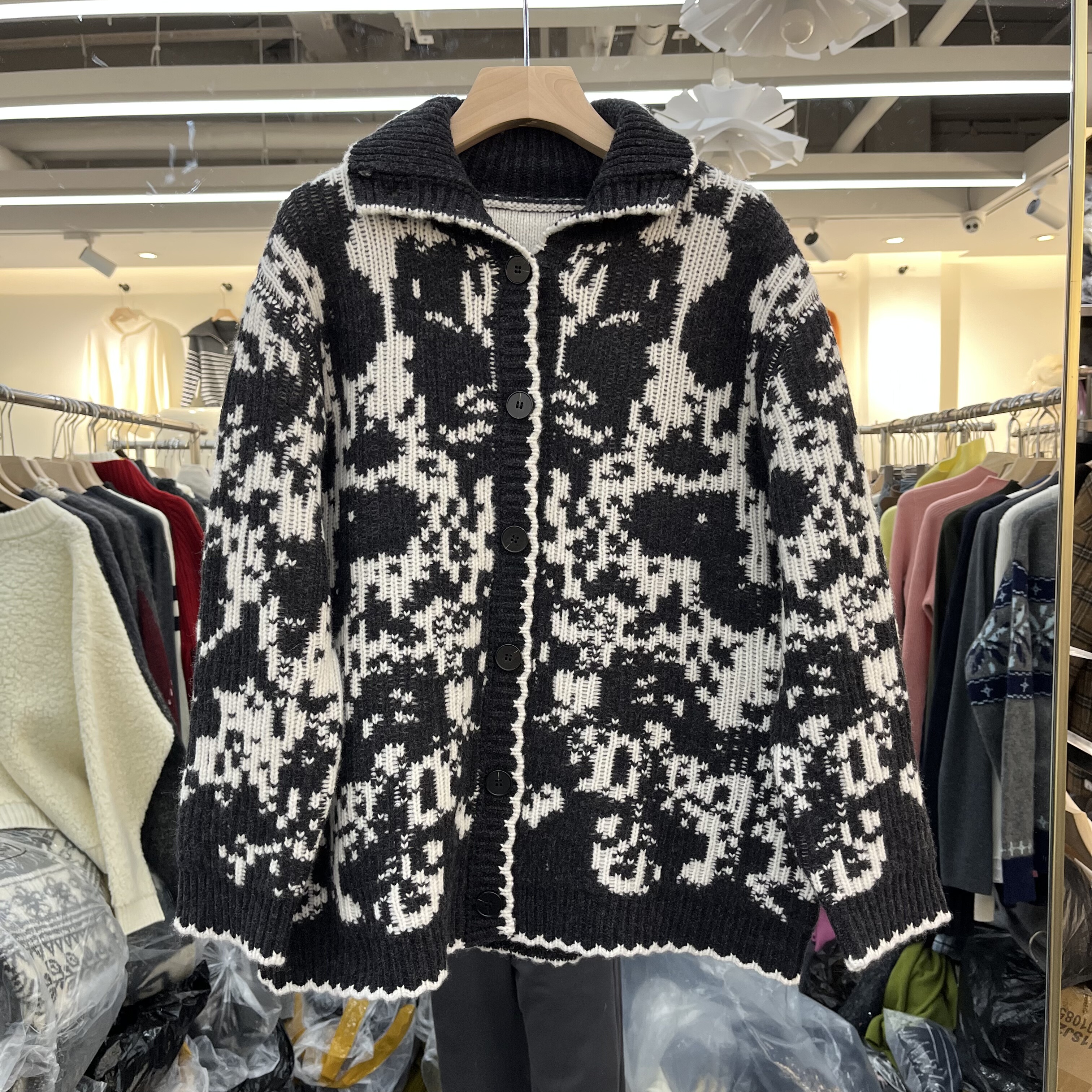 欧洲站2025秋冬新款女士翻领迷彩绣花拼色全羊毛长袖欧货时尚针织