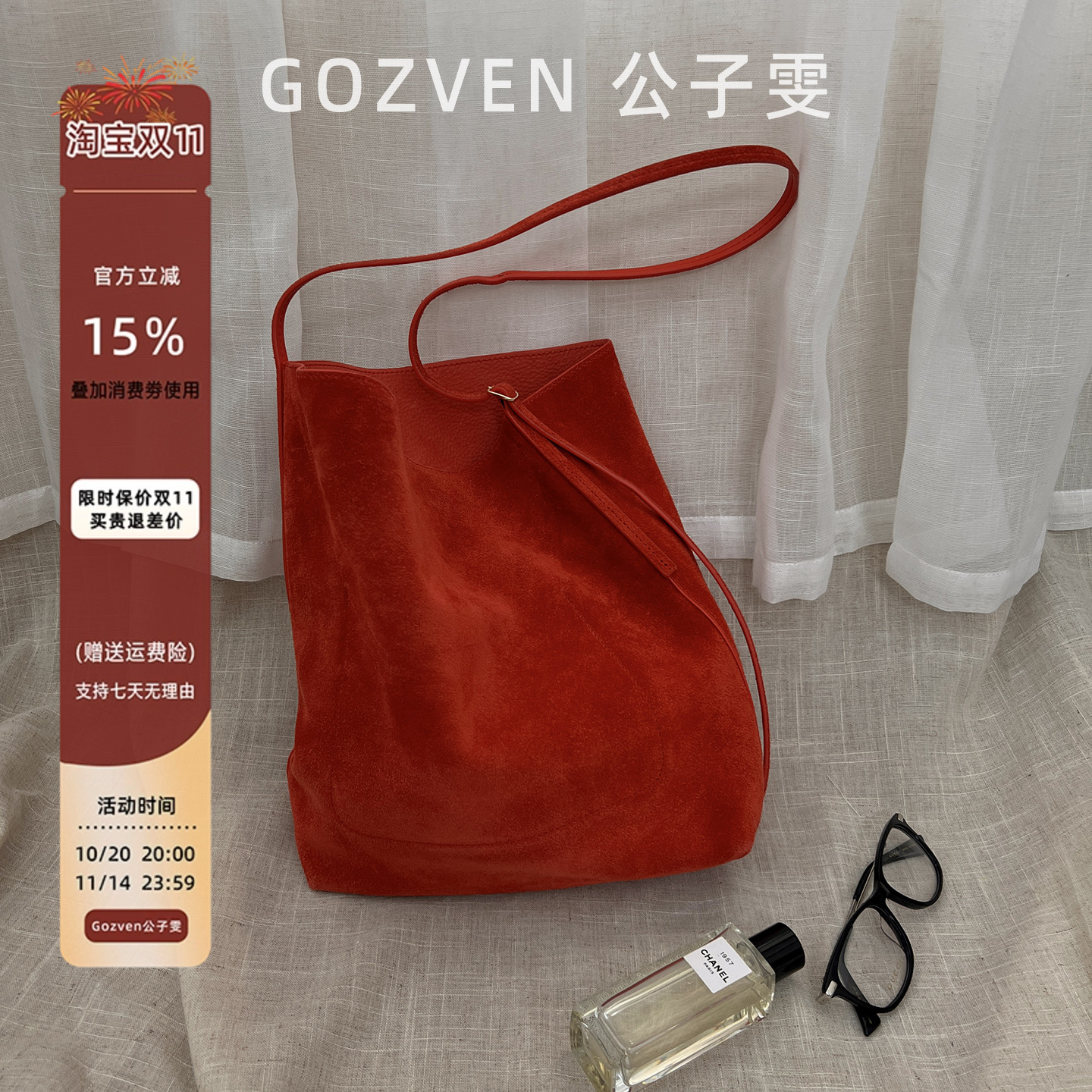 秋冬高圆圆同款进口麂皮通勤大容量复古风单肩斜挎tote托特水桶包