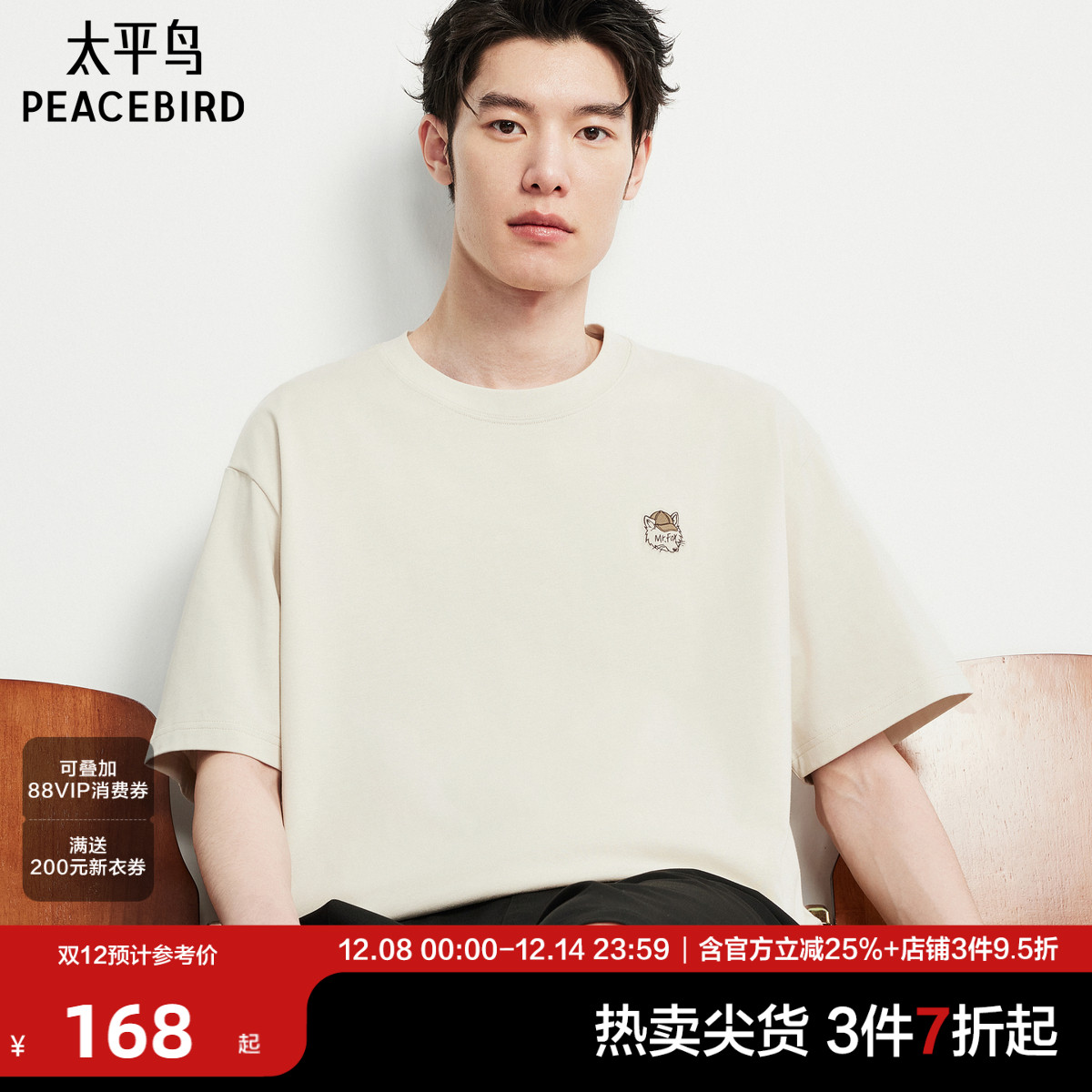 太平鸟男装 小狐狸短袖t恤男25年夏季新款纯色纯棉宽松男生体恤