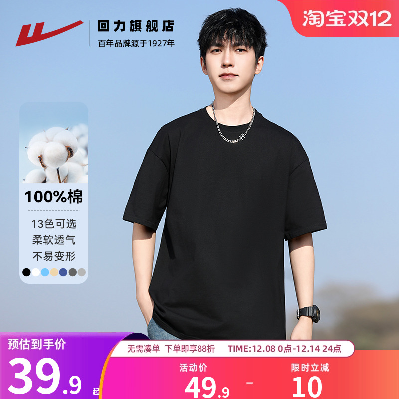 回力短袖t恤男款夏季纯棉纯色新款上衣休闲舒适宽松重磅体恤男生