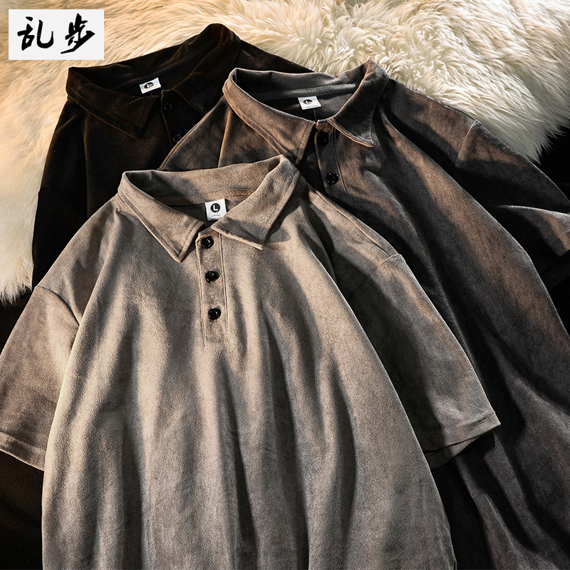 麂皮绒纯色POLO衫短袖男生夏季复古日系街头潮牌宽松百搭翻领T恤