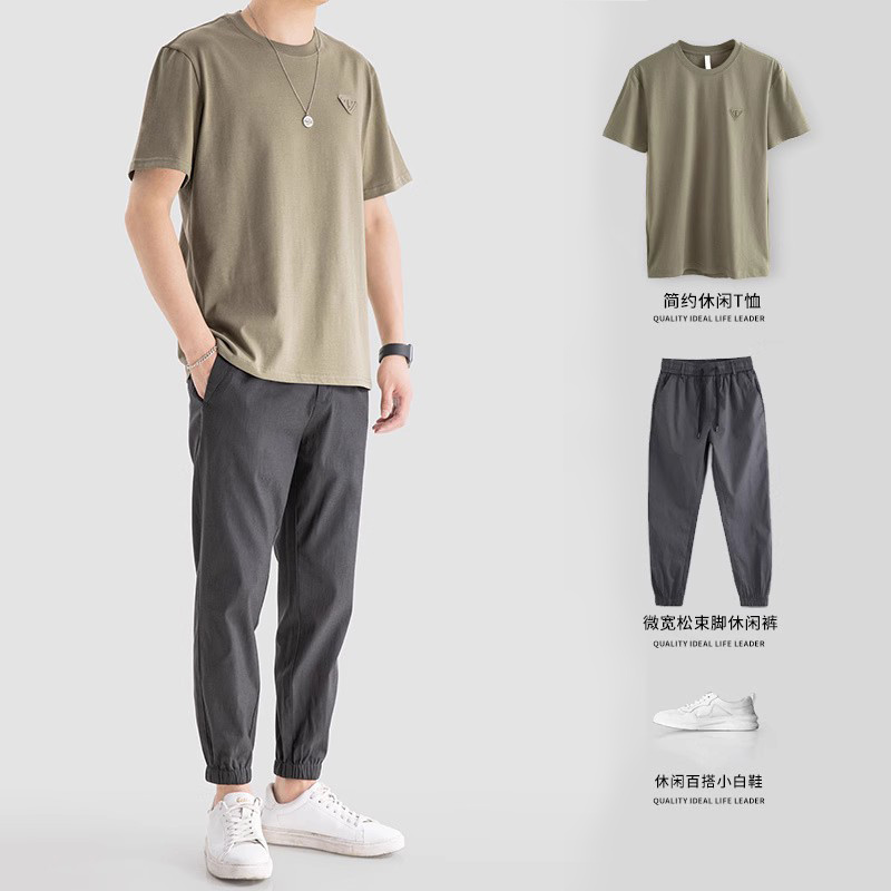 纯色短袖T恤男士夏季薄款宽松男生上衣休闲半袖打底衫男款束脚裤