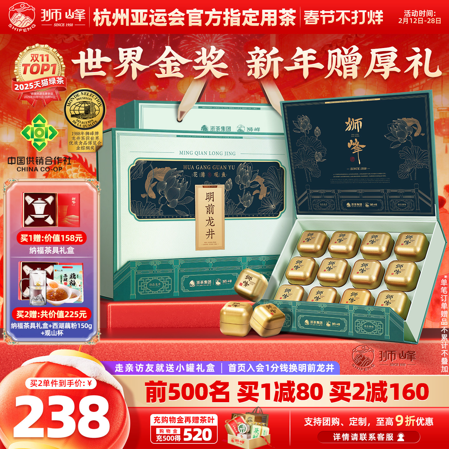 狮峰牌2025新茶特级明前龙井茶叶礼盒装送礼长辈西湖藕粉春绿茶叶