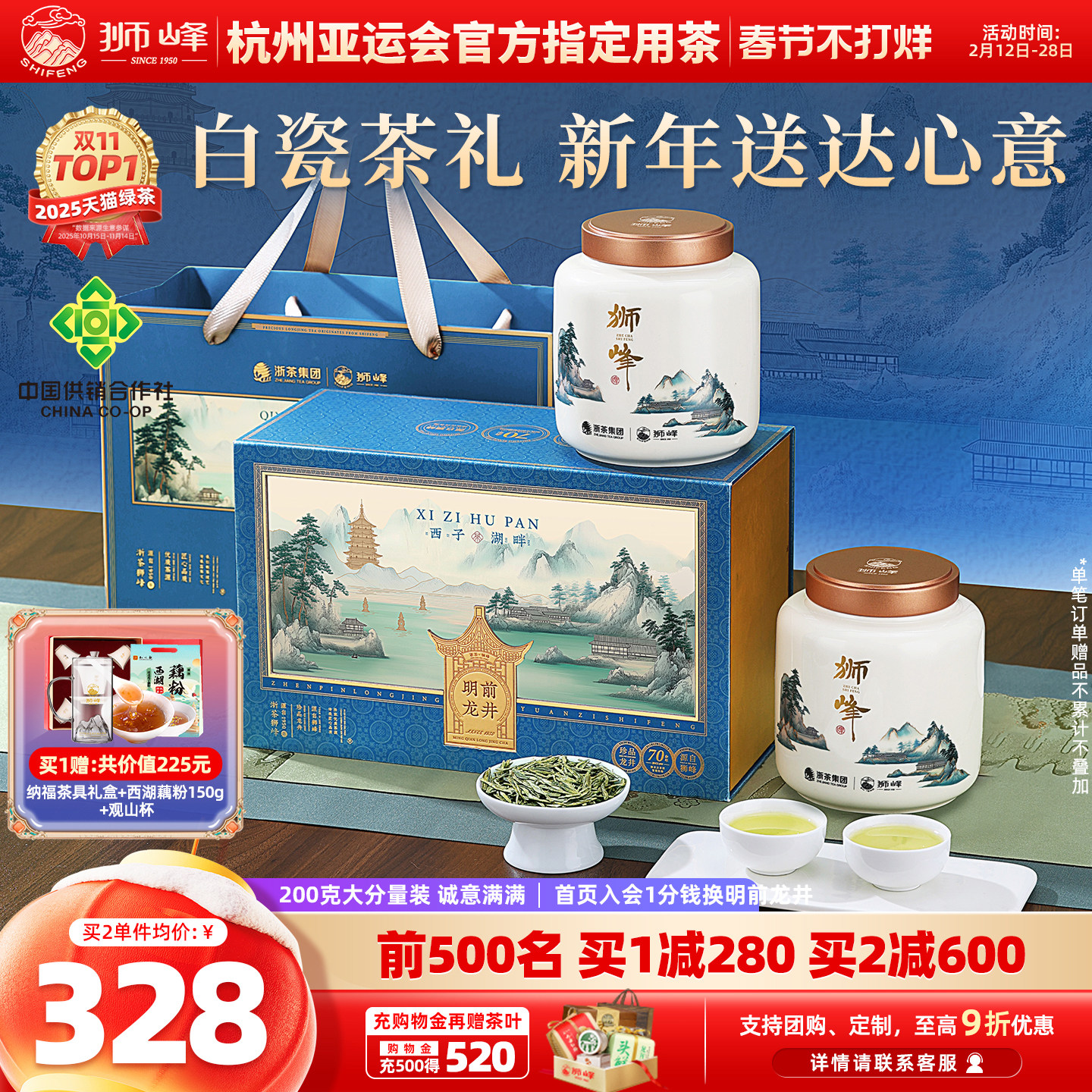 狮峰牌茶叶礼盒装明前龙井茶特级200g绿茶白瓷送礼长辈送西湖藕粉