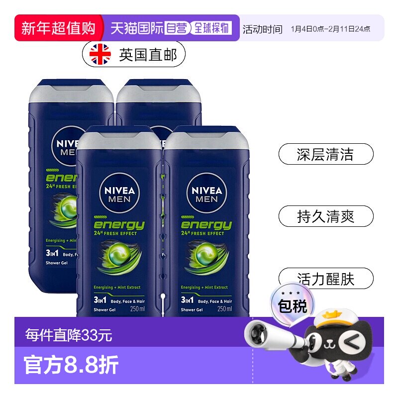 欧洲直邮英国药房NIVEA男士精华能量沐浴露深层洁净活力醒肤*4