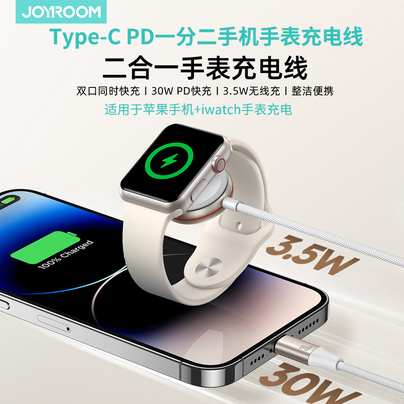 机乐堂 Type-C一分二PD30W快充线Lighting手机手表iwatch磁力充二合一充电线适用苹果iphone13 14pro Max 12