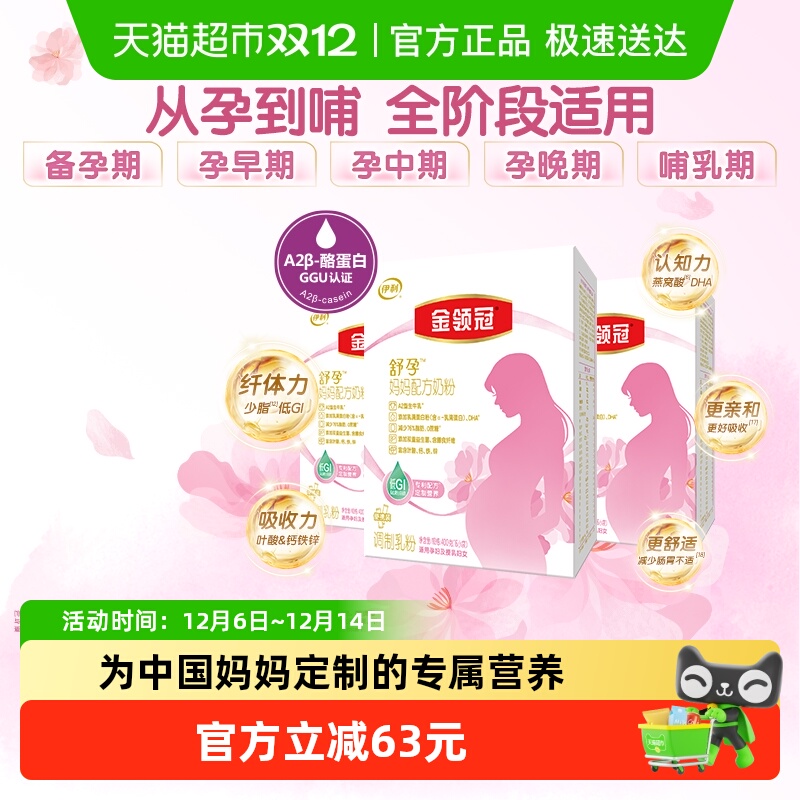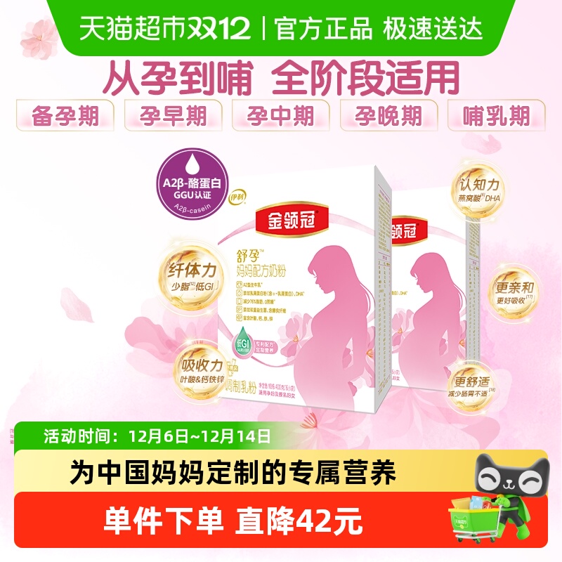 伊利金领冠舒孕产妇孕妇妈妈奶粉400g×2盒基础早中后孕晚期奶粉