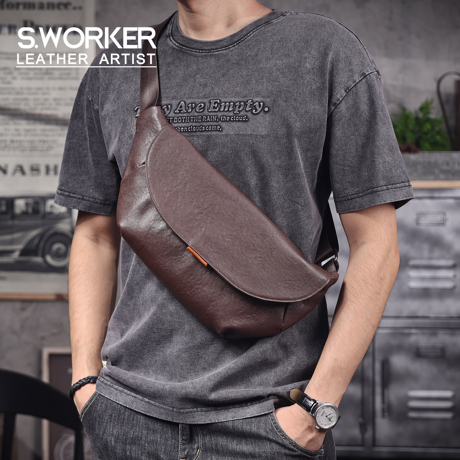 思沃可 简约休闲头层牛皮胸包男时尚单肩包迷你手机包真皮植鞣皮