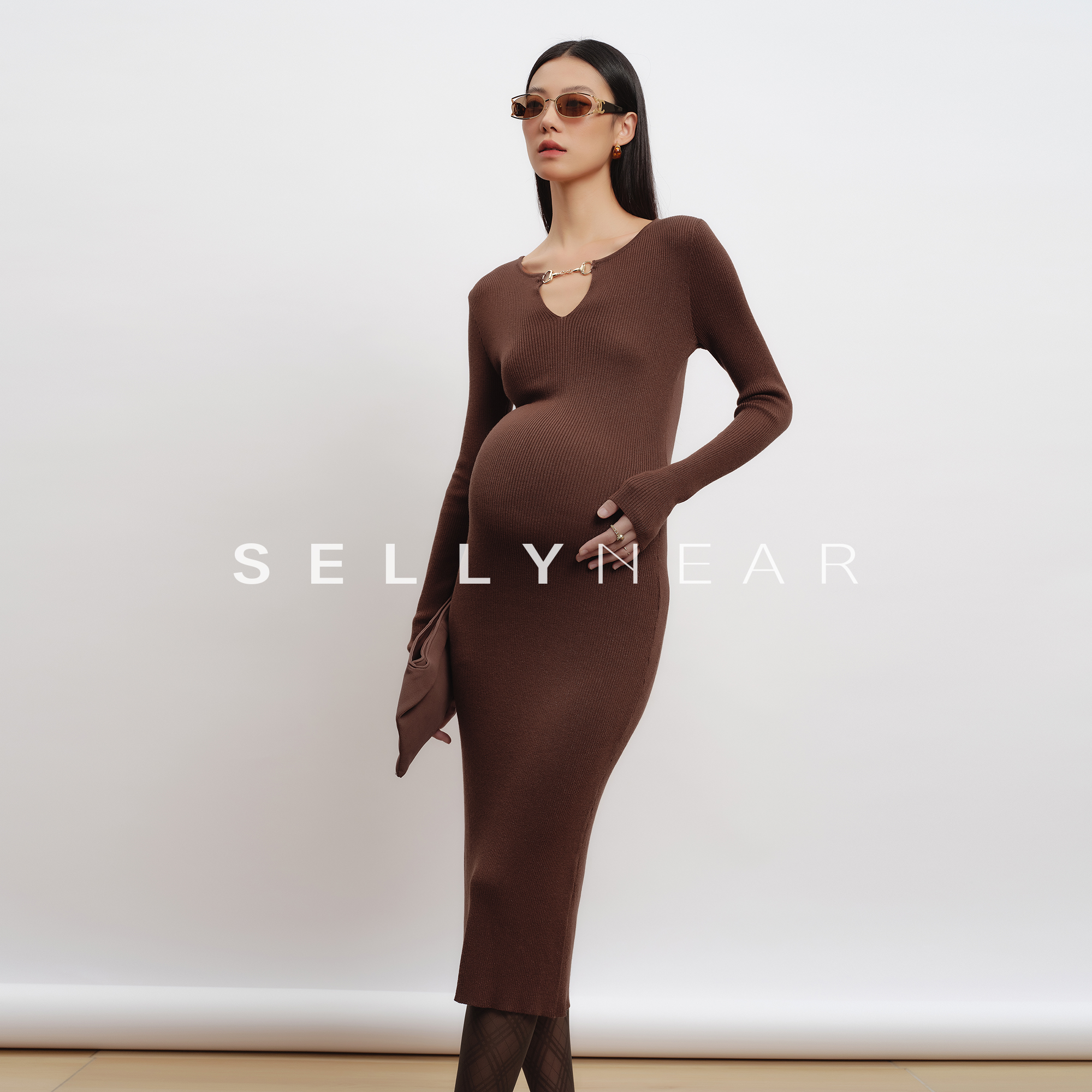 SELLYNEAR孕妇秋冬装针织连衣裙时尚修身法式优雅外出可哺乳裙
