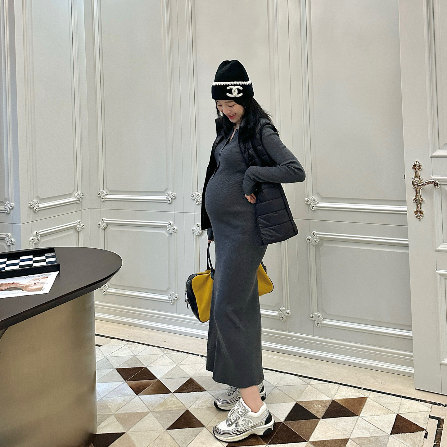孕妇装2024新款春秋季连衣裙修身弹力孕妈高级感穿搭针织裙子潮冬