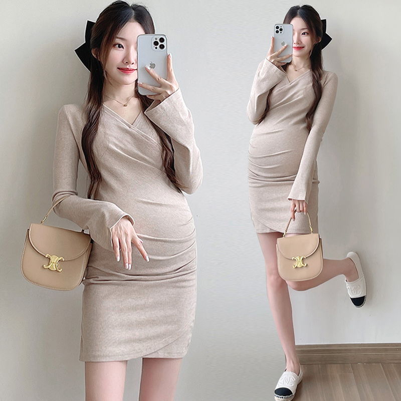 孕妇装秋季V领针织连衣裙修身包臀性感显瘦小个子毛衣打底衫秋冬