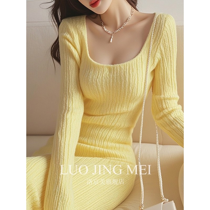 新款别致绝美奶呼呼裙早秋内搭孕妇裙修身黄色针织长袖孕妇连衣裙
