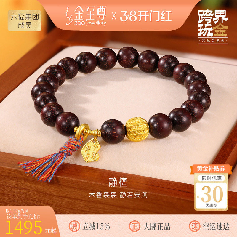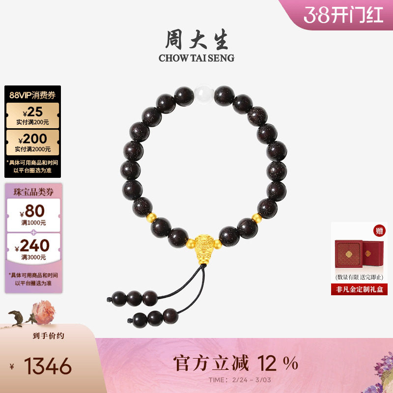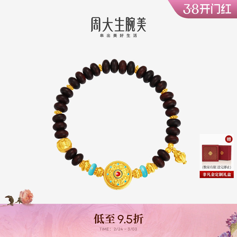 三八节礼物周大生腕美黄金足金檀木八宝罗盘手串小叶紫檀单圈手链