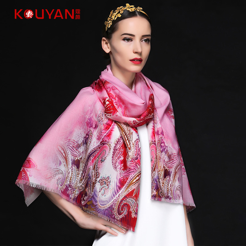 100%羊毛围巾女秋冬中厚款 超长保暖披肩针织围脖两用 花卉喷绘